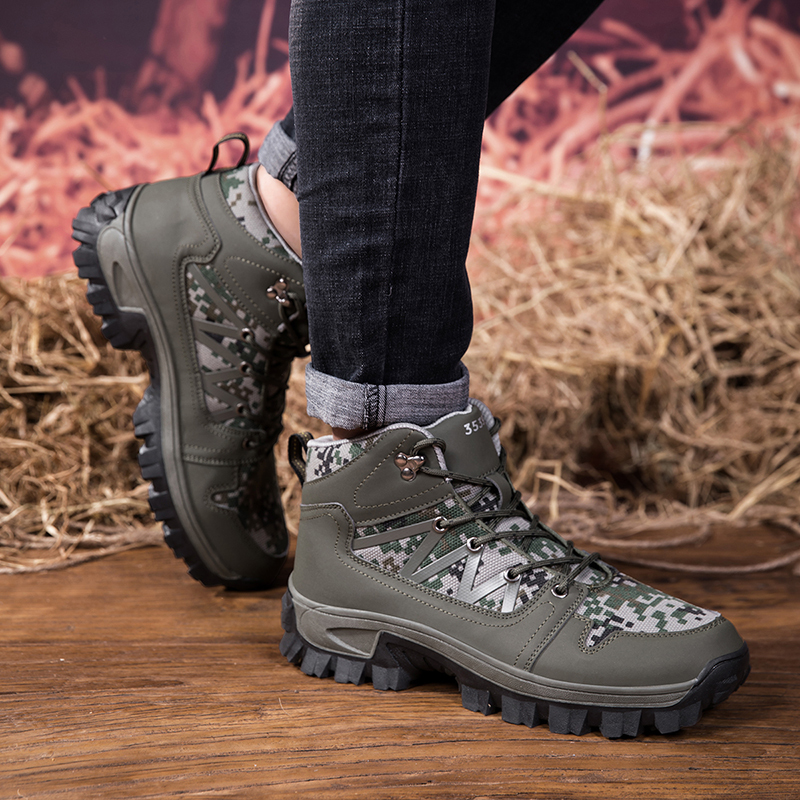 Engineered with a rugged combination of durable camouflage fabric and high-performance PU leather, this upper delivers exceptional toughness and weather resistance for demanding outdoor adventures. The military-inspired camouflage textile offers superior abrasion resistance and breathability, while the strategically placed synthetic leather panels provide reinforced structure and water-repellent protection where it matters most—around the toe, heel, and lacing zones.